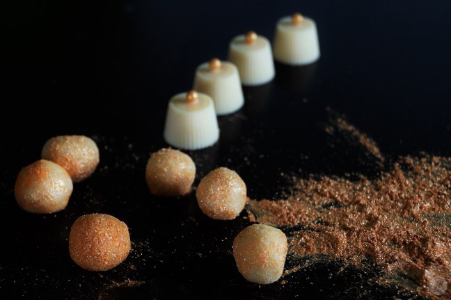 - Die Ganache in einen Spritzbeutel füllen und vorbereitete Hohlkörper füllen oder wenn man mag einfach Kugeln rollen und diese anschließend in Goldpuder mit ein wenig Orangenabrieb wälzen.