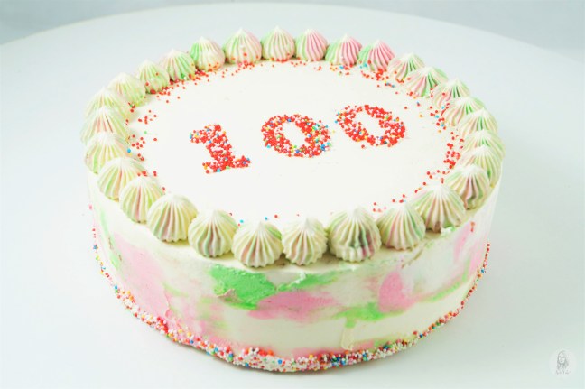 - Aus Papier habe ich mir eine 100 Schablone zugeschnitten. Diese auf die Torte legen und die Zuckerperlen darauf verteilen.